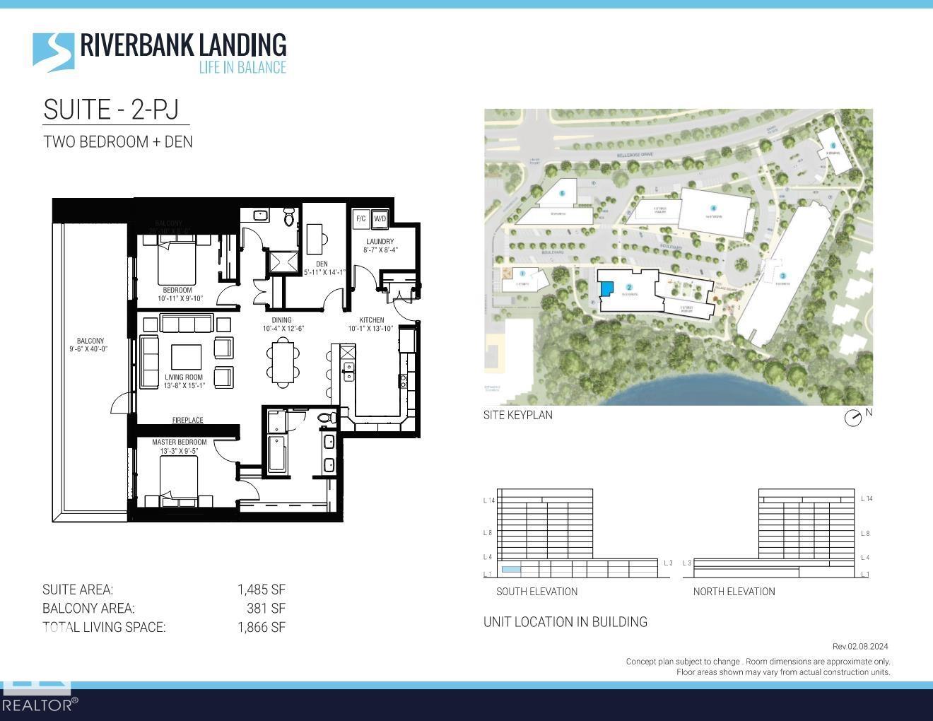 Welcome to Riverbank Landing!! A premium live, work & play development located along the banks of the beautiful Sturgeon River Valley in St Albert. Solid concrete steel construction. This spacious (1,485 sf) 2 bedroom plus den offers top line features throughout; 9 ft ceilings, oversized windows, quartz countertops, porcelain tile, plank flooring, linear style fireplace, premium appliance pkg and much more!! Underground heated parking and storage is also included. Dedicated fresh air intake with forced air heating and A/C. Amenities incl; spacious event centre, 3 elevators, fitness facility, car wash, guest suite, residents lounge with rooftop patio. Personalize your suite with the choice of 6 designer packages. Only steps to boutique shopping, Italian market, unique restaurants & professional services. Direct access to over 65 kms of tranquil walking trails. Select now and take possession in fall/2025!!