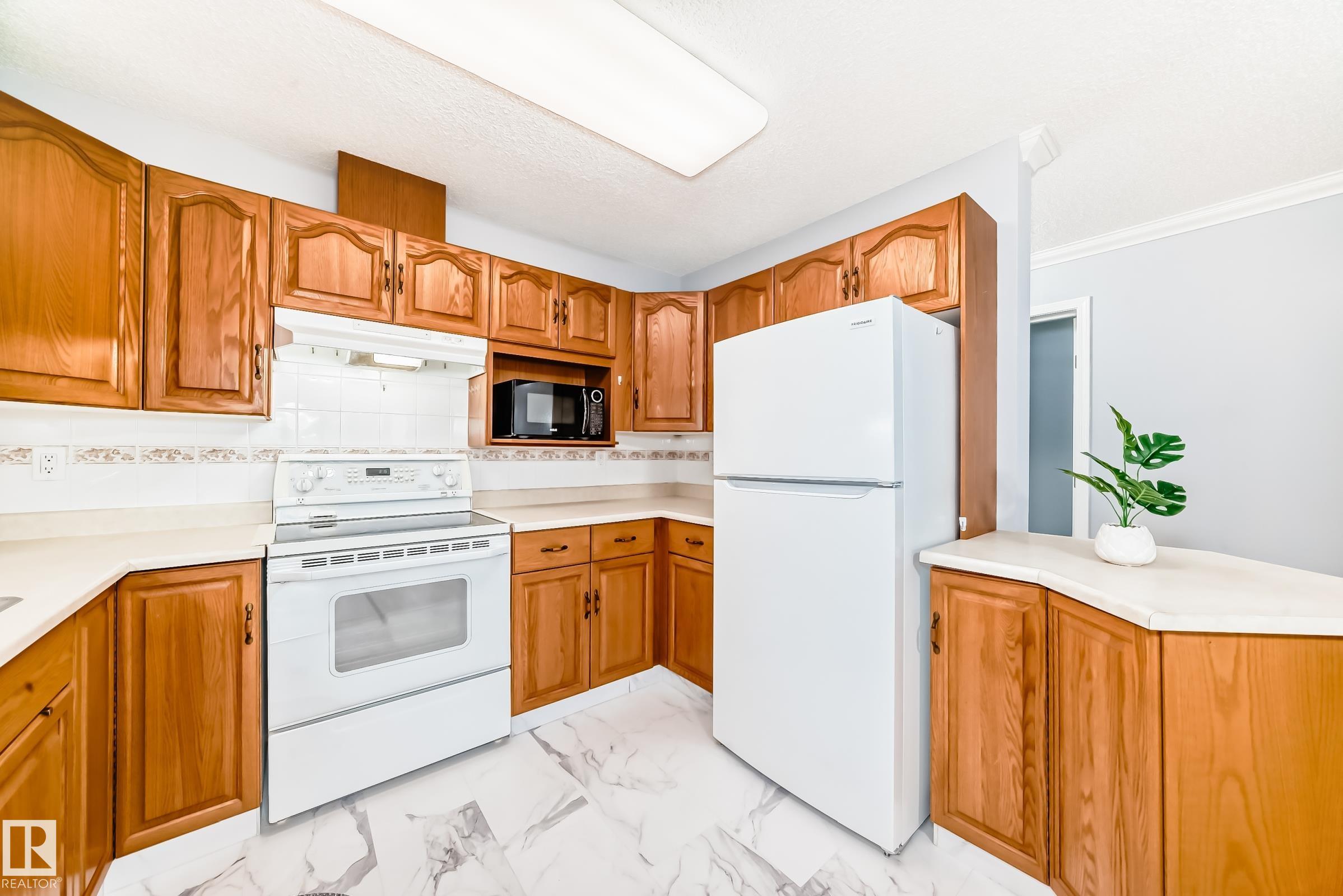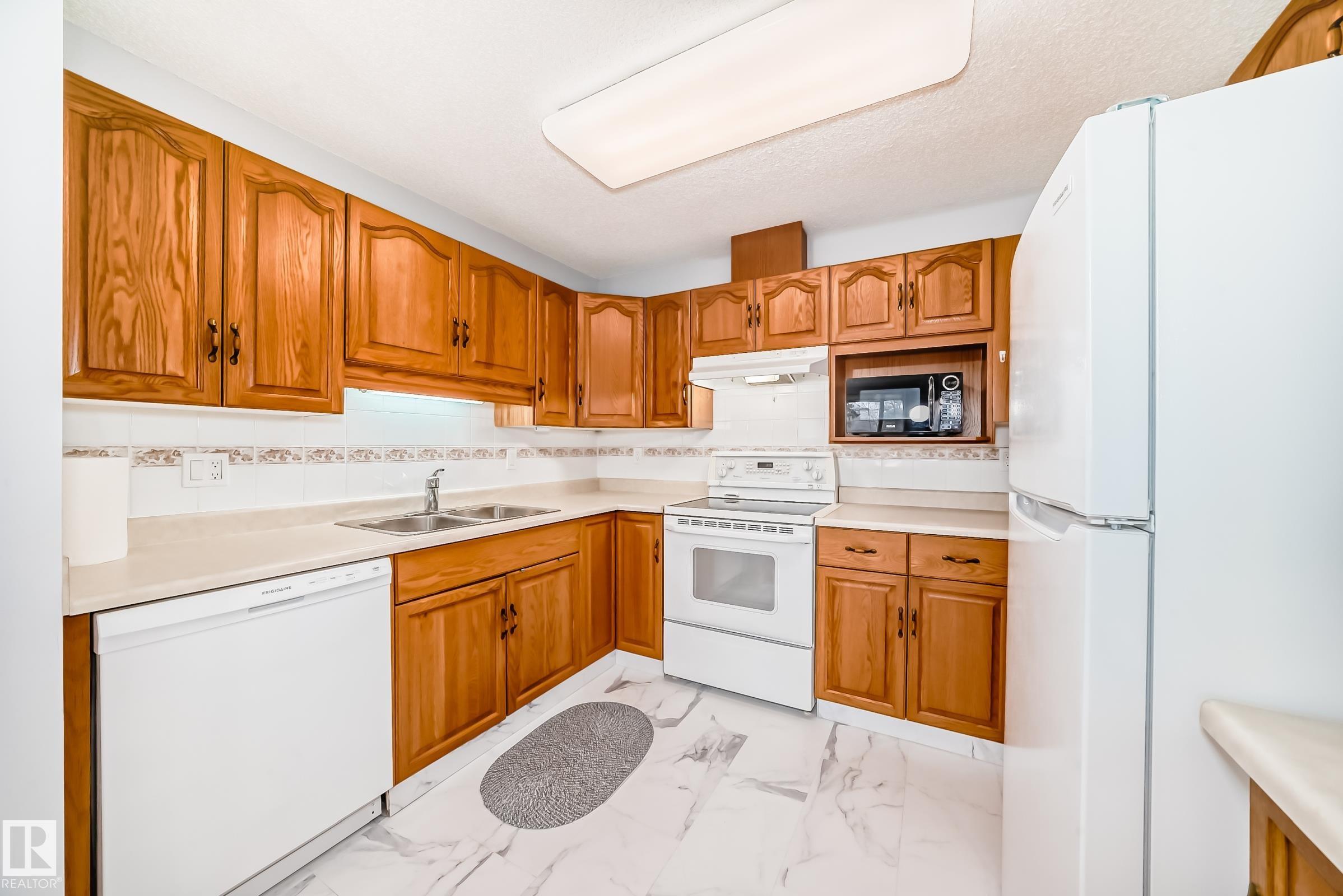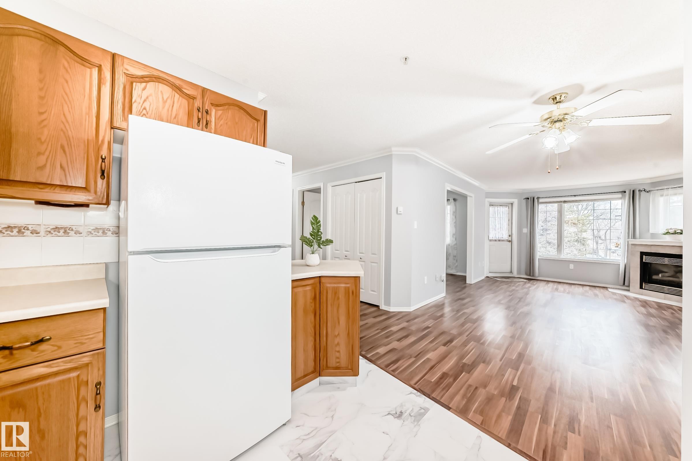 Pride of ownership is clearly evident as you enter this freshly painted & upgraded one bedroom & den in the Californian Manor! The open concept layout is spacious with lots of room to enjoy & entertain! Upon entering the suite you have the laundry room to the left with newly installed interlock vinyl tiling, large oak kitchen to the right that looks out to the combined dining/living room area with ceiling fan & gas f/p with beautiful laminate floors! The patio doors lead out to a treelined view. From living area you step into the open & airy den/TV room (potential of 2nd bedroom if wall closed). The master bedroom is spacious with ceiling fan, laminate floors & lovely walk in closet. The 4 piece bath is bright & spacious. This 50+condo has a social room, craft room, exercise room, car wash bay in u/g parkade & added bonus of a one bedroom guest suite that owners can rent out for their guests! The condo's social committee hosts a lot of events throughout the year for all the owwners to enjoy!