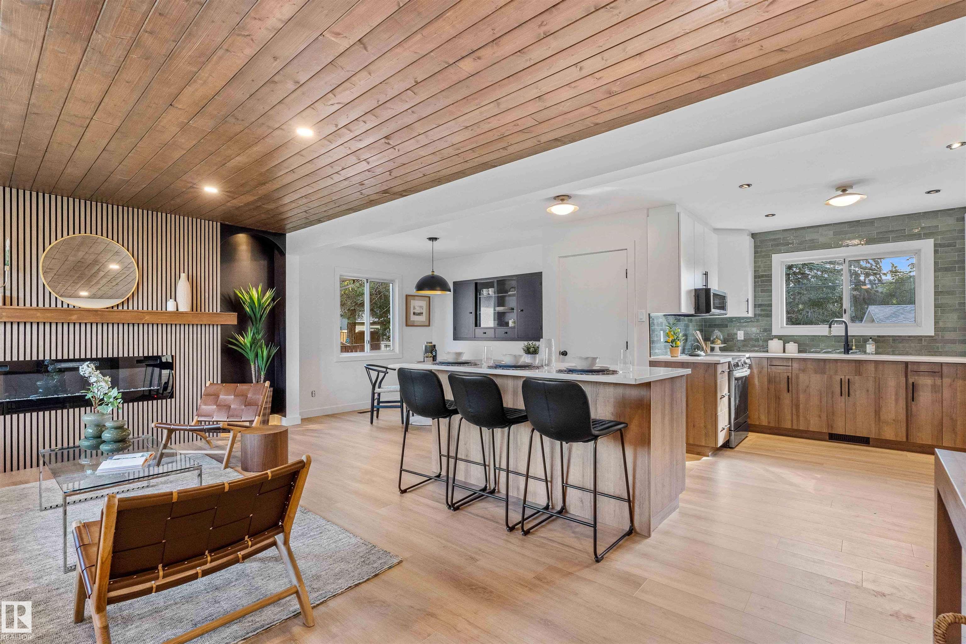 Experience elevated living in this fully renovated Mid-Century Modern bungalow, perfectly blending timeless design with contemporary luxury. This turnkey home offers 3 bedrooms up and 2 down, with a bright open floor plan dressed in luxury vinyl plank flooring. The striking slat wall fireplace with built-in shelving and mood lighting creates a stunning focal point, while the two-tone kitchen impresses with a large island, quartz countertops, undermount sinks, BRAND NEW Stainless Steel Appliances, and sleek LED lighting throughout. The primary suite showcases a dramatic feature wall that flows seamlessly into the custom walk-in closet. A SEPARATE ENTRANCE leads to a fully developed basement with 2ND KITCHEN and large living area. Peace of mind comes with a BRAND NEW FURNACE, while outdoor living shines with a NEW DECK, Firepit Area, and expansive backyard for entertaining. Complete with a double detached garage. Basement windows do not meet current egress requirements