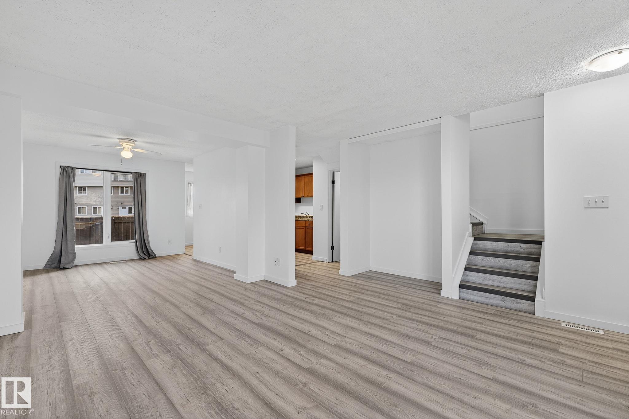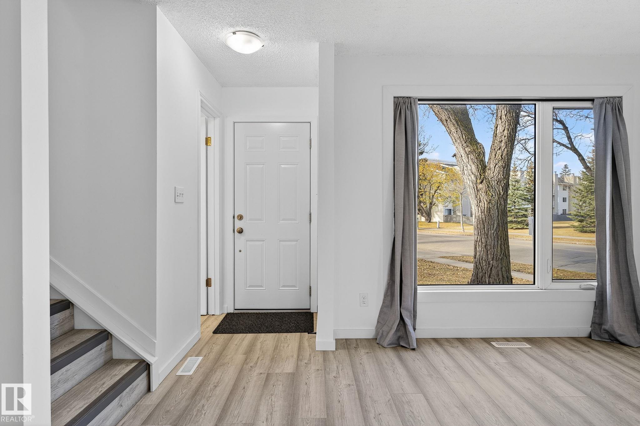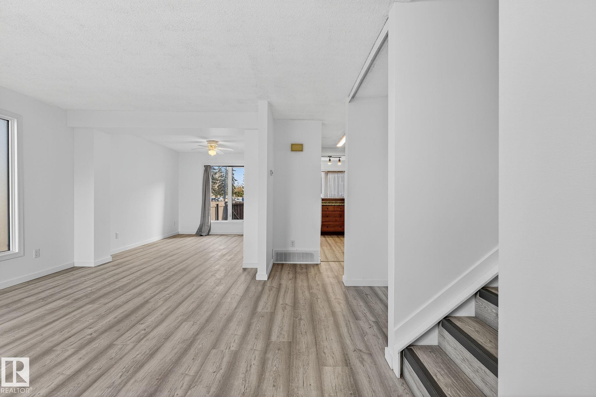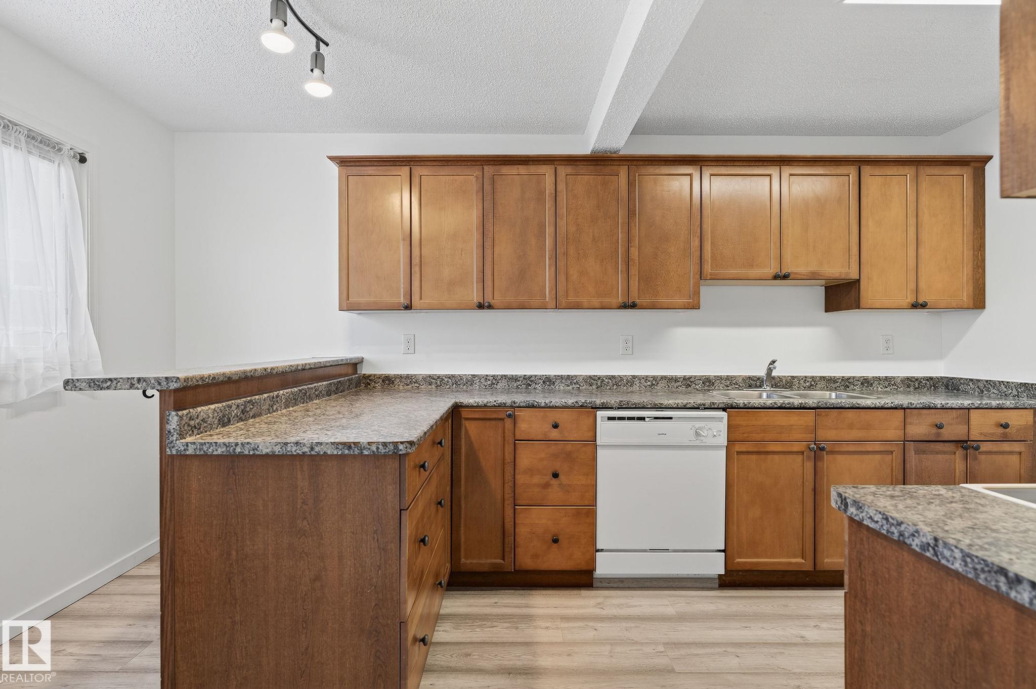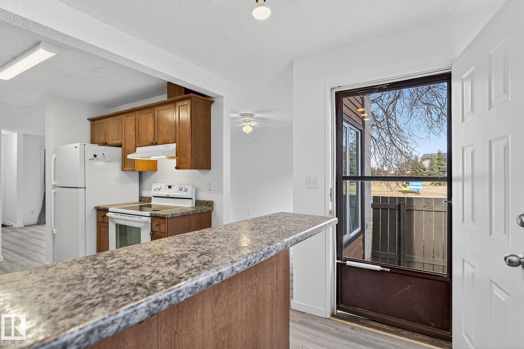 Welcome home to this bright 1,223sq ft end-unit townhouse backing greenspace in Dunluce, with two parking stalls in front. Step inside to find large windows filling the main floor with natural light. Easy-care flooring flows through the home and with no carpet anywhere it's perfect for the family with a busy lifestyle. The open living room connects seamlessly to a generous dining area, ideal for entertaining. The kitchen offers plenty of cabinetry, counter space, and a cozy eat-in nook. A convenient 2-piece bath completes the main floor. Upstairs, discover three bedrooms including a large primary suite with full-length closets, plus a 4-piece family bath. The fully finished basement adds a rec room, flex space, and tons of storage. Outside, enjoy a private fenced yard?great for summer BBQs. Located across from a park, within walking distance to schools and playgrounds, and minutes from shopping, dining, and transit?this is comfortable, convenient living at its best! A must see to truly be appreciated.