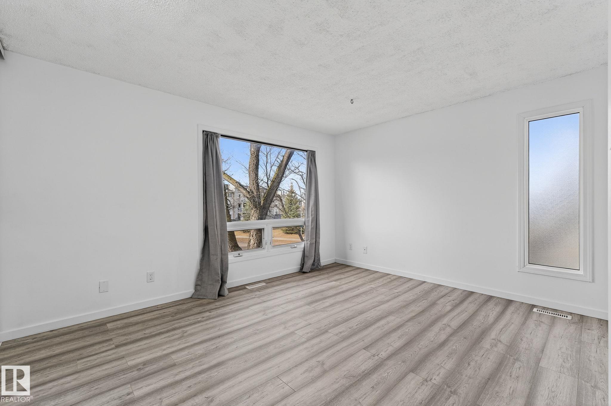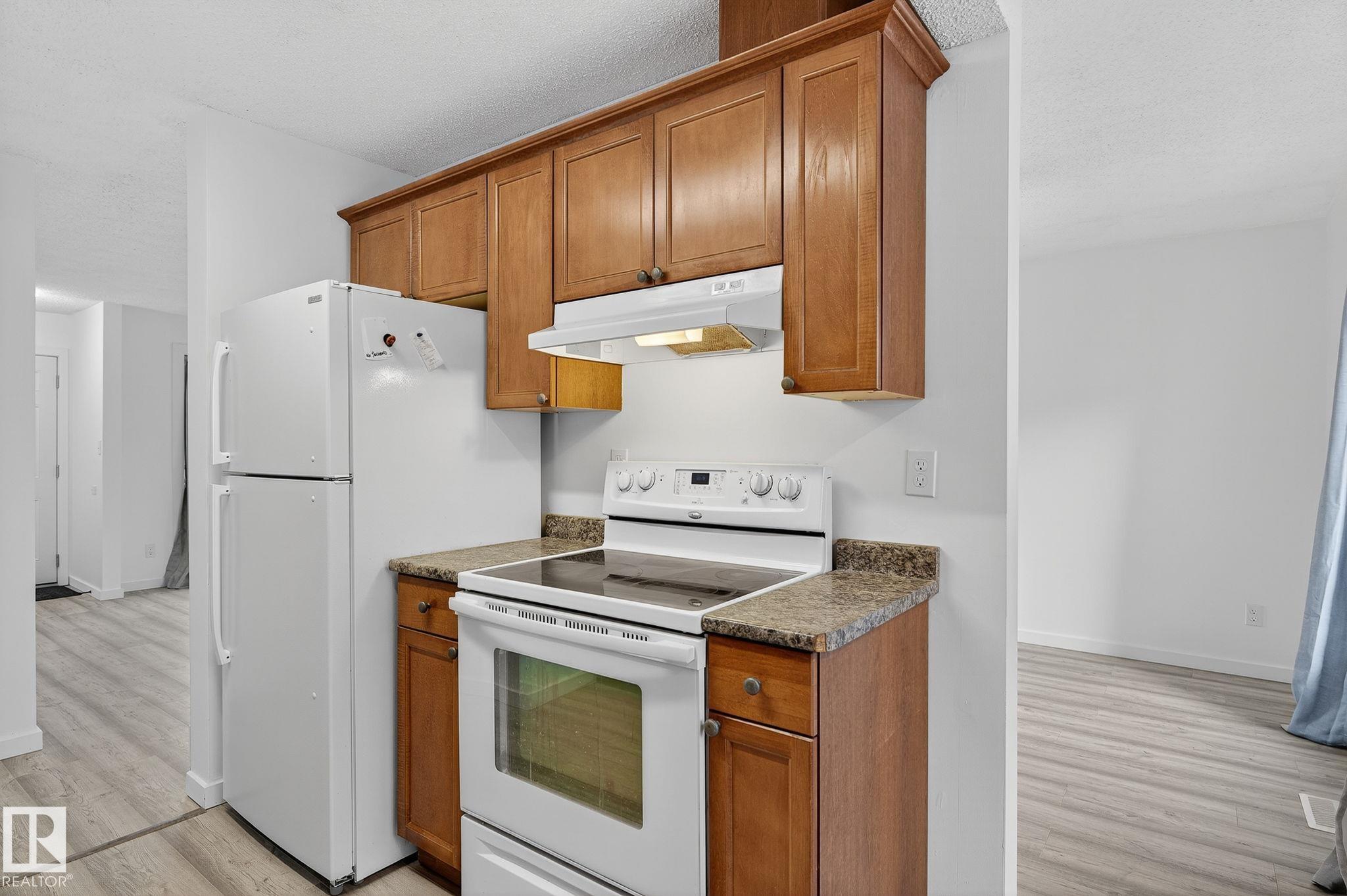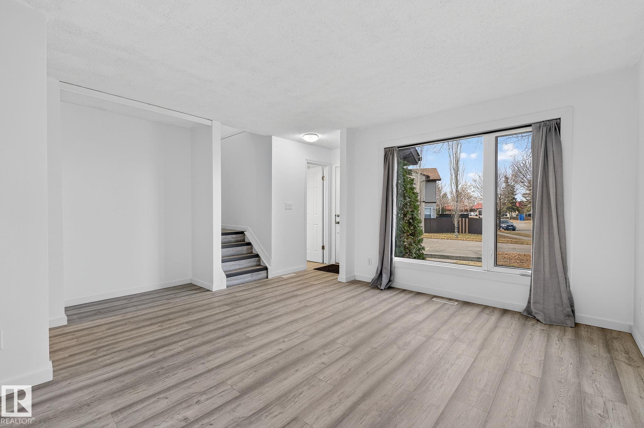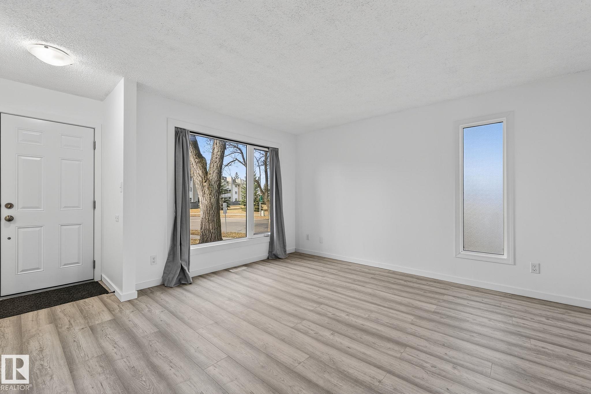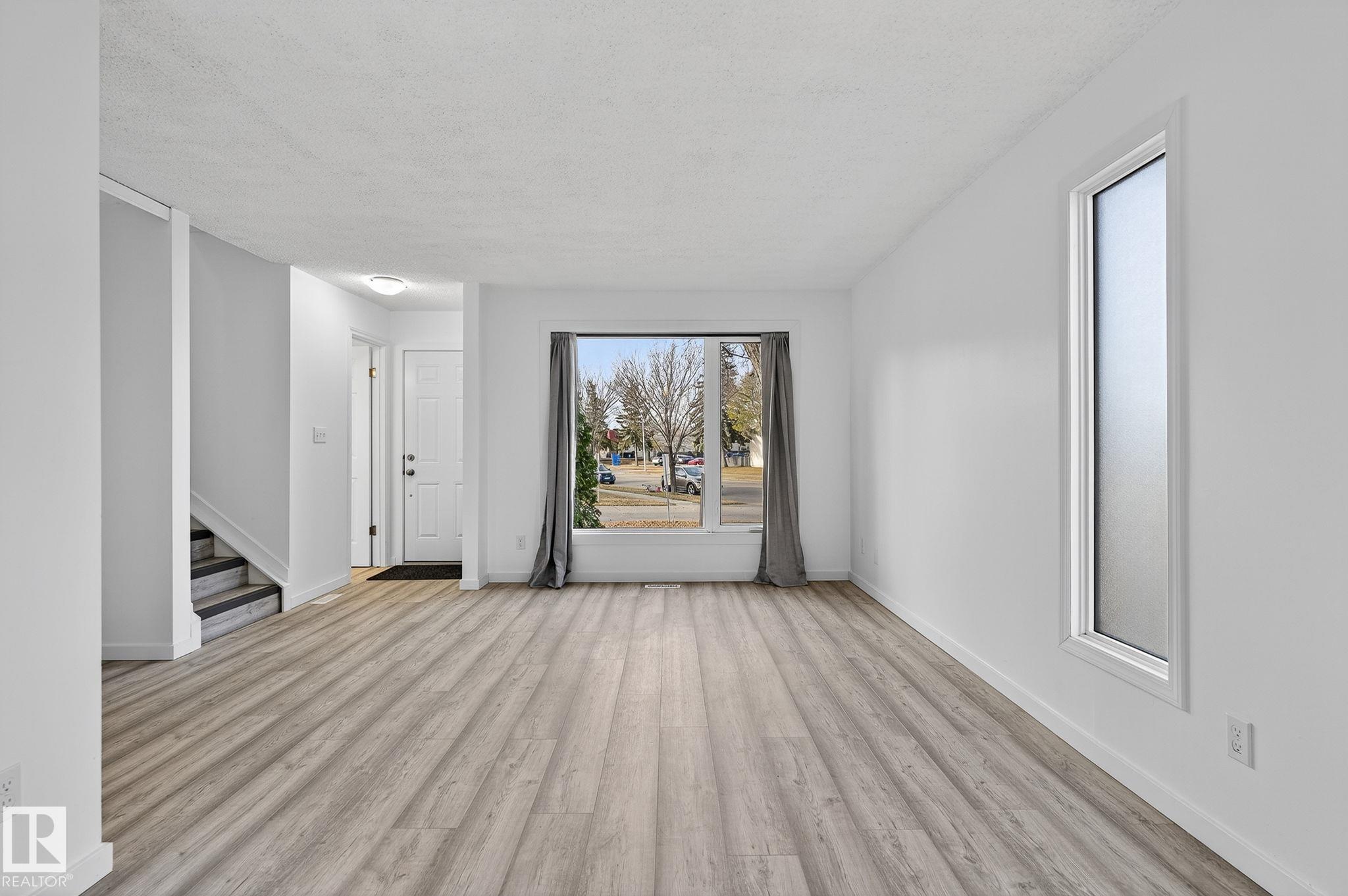 Welcome home to this bright 1,223sq ft end-unit townhouse backing greenspace in Dunluce, with two parking stalls in front. Step inside to find large windows filling the main floor with natural light. Easy-care flooring flows through the home and with no carpet anywhere it's perfect for the family with a busy lifestyle. The open living room connects seamlessly to a generous dining area, ideal for entertaining. The kitchen offers plenty of cabinetry, counter space, and a cozy eat-in nook. A convenient 2-piece bath completes the main floor. Upstairs, discover three bedrooms including a large primary suite with full-length closets, plus a 4-piece family bath. The fully finished basement adds a rec room, flex space, and tons of storage. Outside, enjoy a private fenced yard?great for summer BBQs. Located across from a park, within walking distance to schools and playgrounds, and minutes from shopping, dining, and transit?this is comfortable, convenient living at its best! A must see to truly be appreciated.