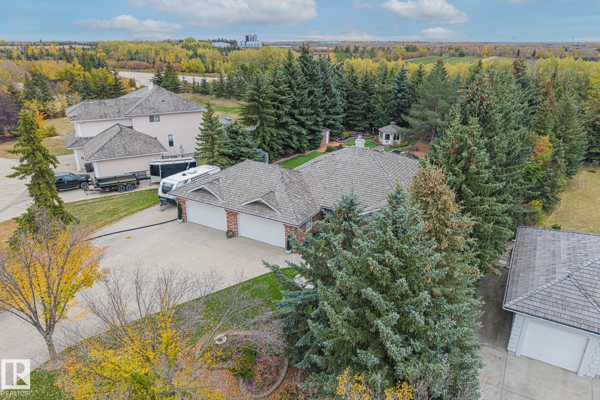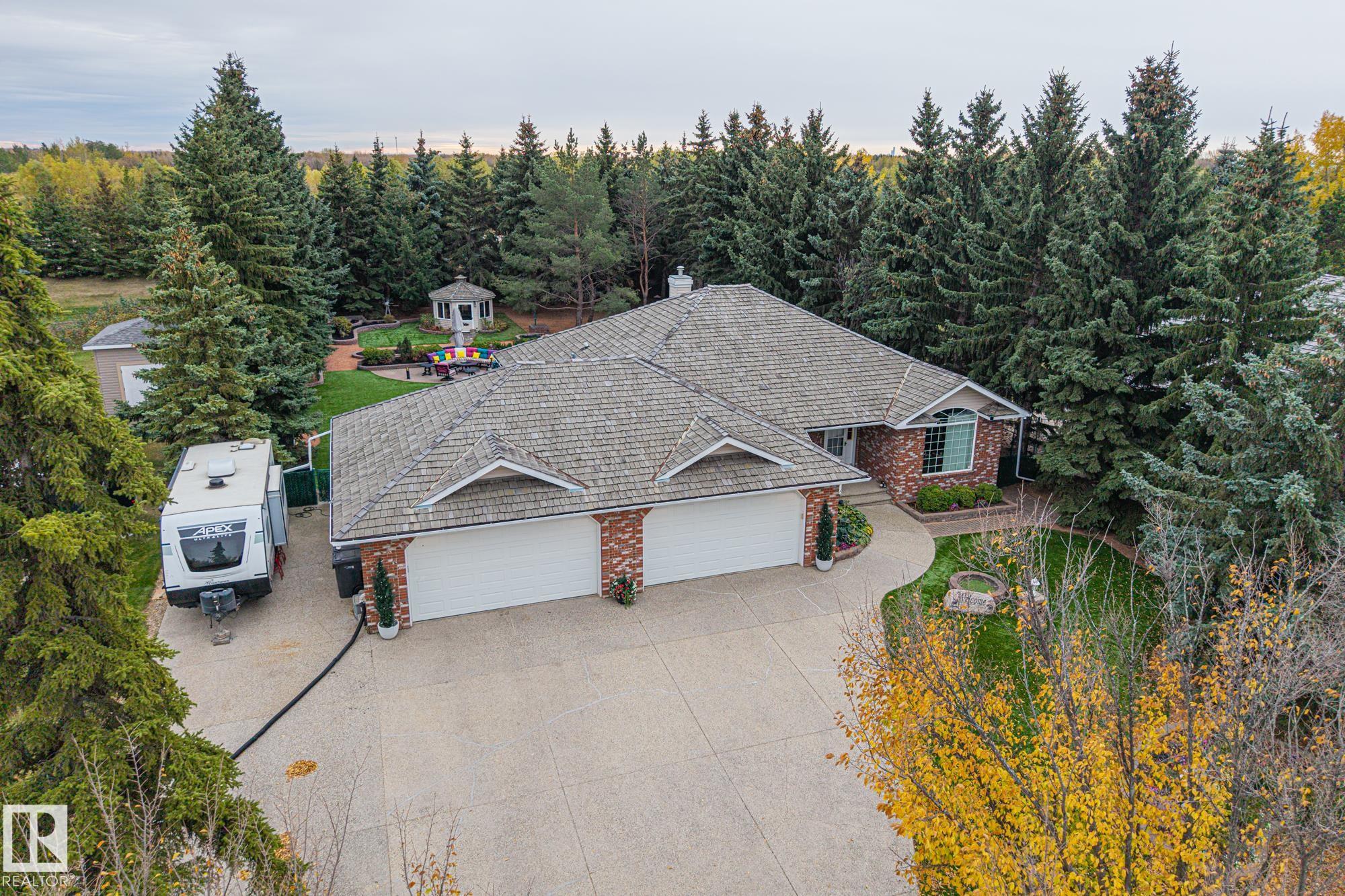 The acreage property you?ve been dreaming of just hit the market! This exceptional custom estate bungalow includes a F/F basement on a private, fully fenced lot with all-turf front and back yards and RV parking. Main floor features vaulted ceilings, a large dining room with double-sided gas fireplace to the living room, and 2-tone custom kitchen with crown moulding, granite, and Elmira appliances. Primary suite with 4-piece ensuite and W/I closet, plus 2nd bed/den, 3-piece bath, laundry, and mud room. Basement with new flooring (2022) includes huge rec room with wet bar, two large bedrooms, den, and 4-piece bath and storage. Highlights: hybrid septic system(grey water to city, black to holding tank), new vinyl plank (2025), fresh paint (2021), upgraded 220 power (2022), 75L HWT (2023), industrial AC, in-floor heated 4-season room, powered gazebo, and O/S 4-car heated, soundproofed garage with epoxy flooring, hot/cold taps and 3-piece bath. Perfect for family living and entertaining.
