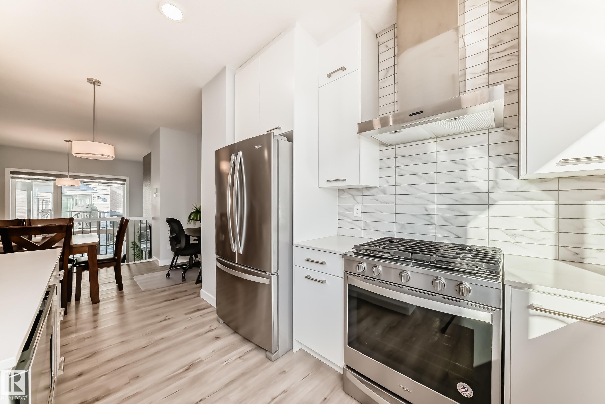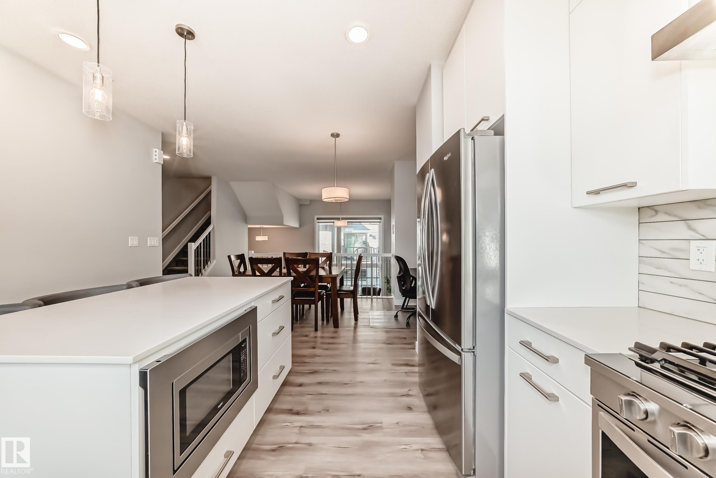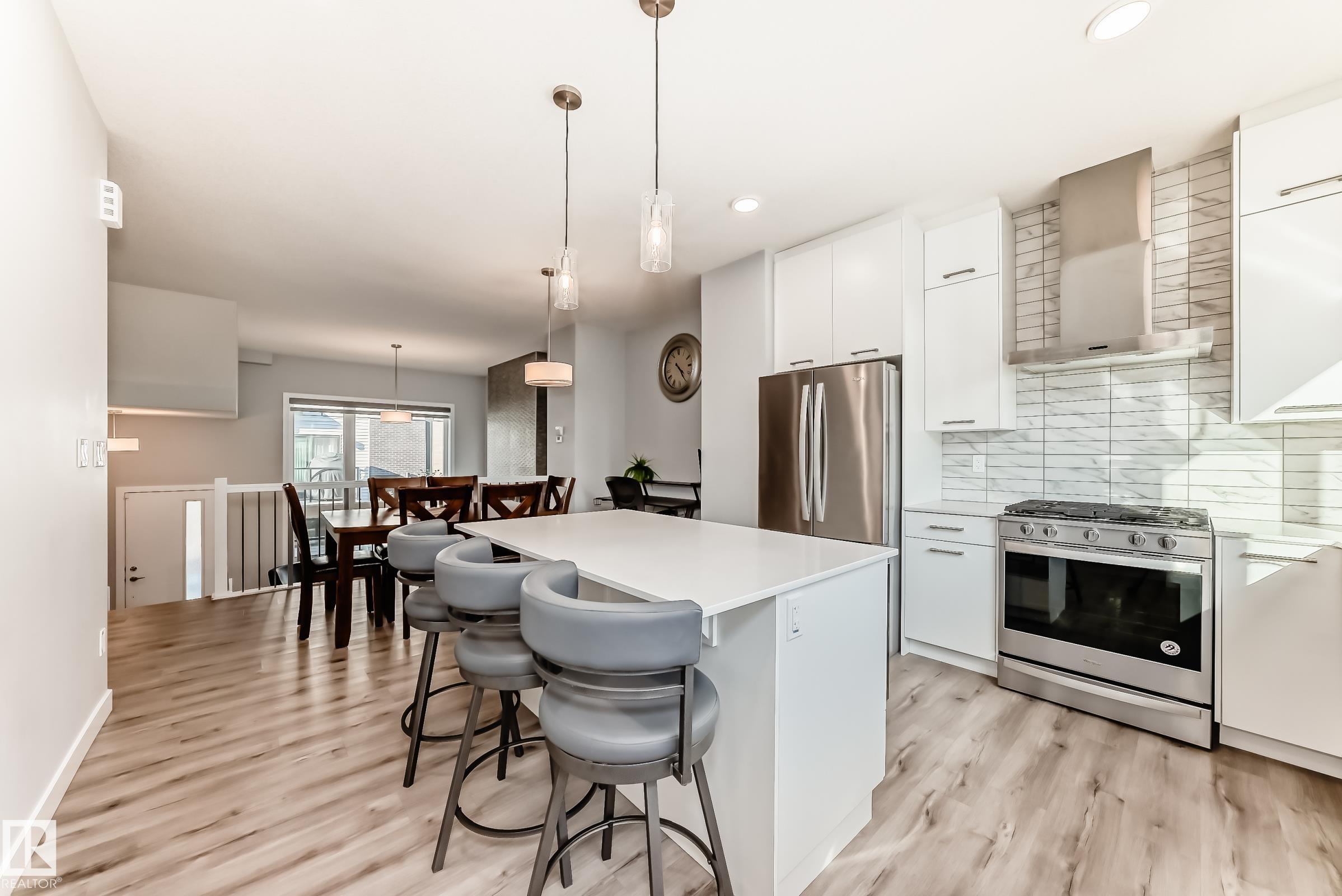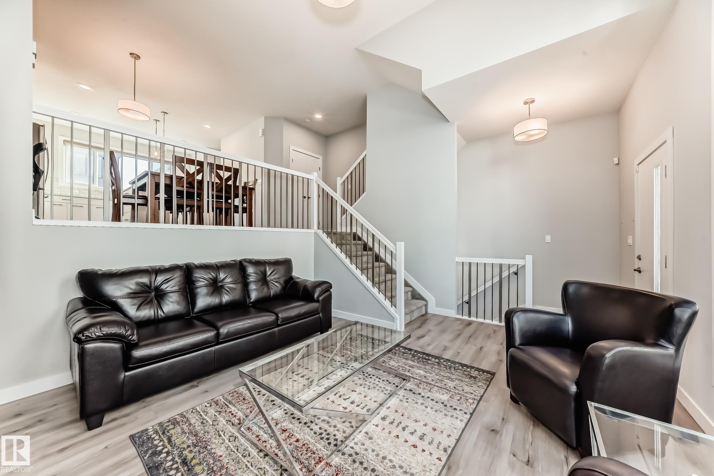 Extremely well-maintained 2-storey home in sought-after Emerald Hills, just steps from all amenities! This Paris II model by Cantiro Homes offers charming curb appeal with a front veranda and BBQ gas line. Inside, the welcoming foyer opens to a stunning living room with soaring vaulted ceilings, highlighted by an electric fireplace with a floor to ceiling tile surround. The bright kitchen overlooks the living room and features stainless steel appliances, a central island, and quartz countertops. Upstairs, the spacious primary suite boasts a walk-in closet and 4 piece ensuite. Two additional bedrooms and the convenience of upper-level laundry complete the Upstairs. The basement provides a large flex space perfect for a home office, gym, or extra storage along with direct access to the double attached garage.