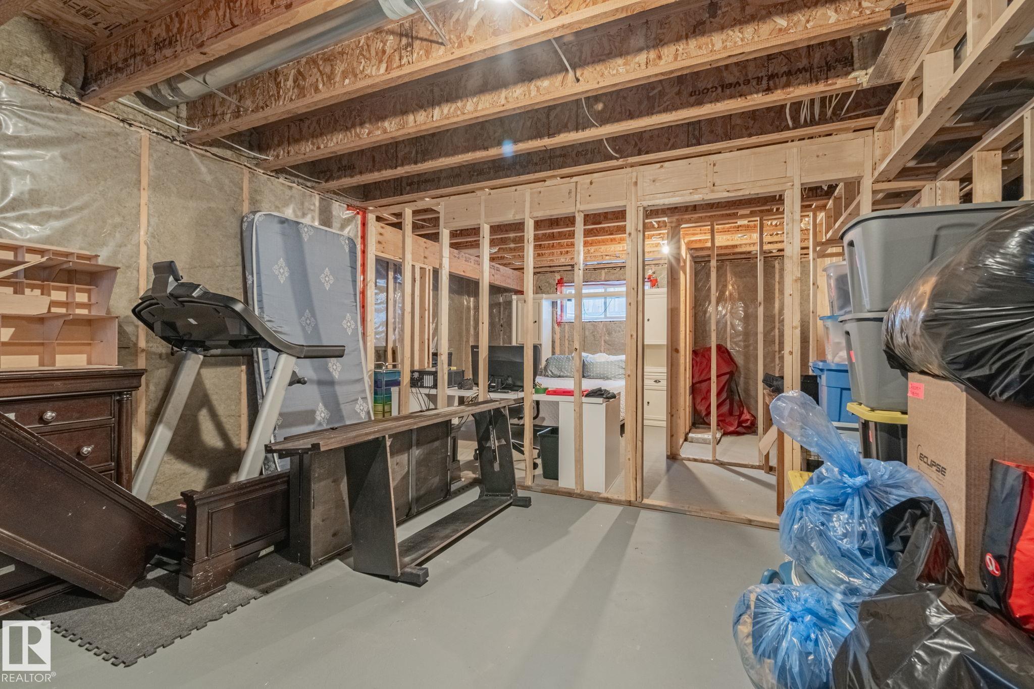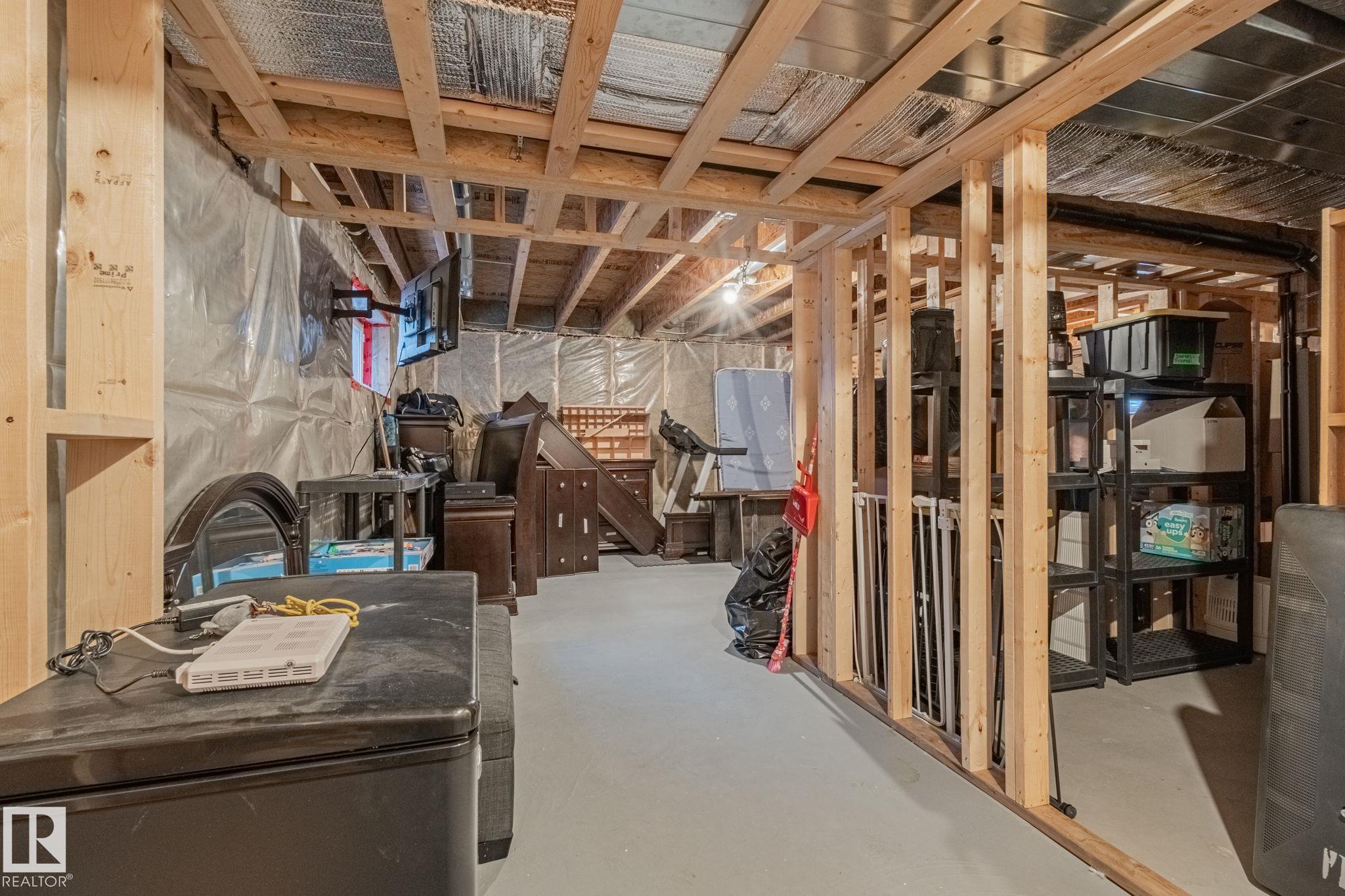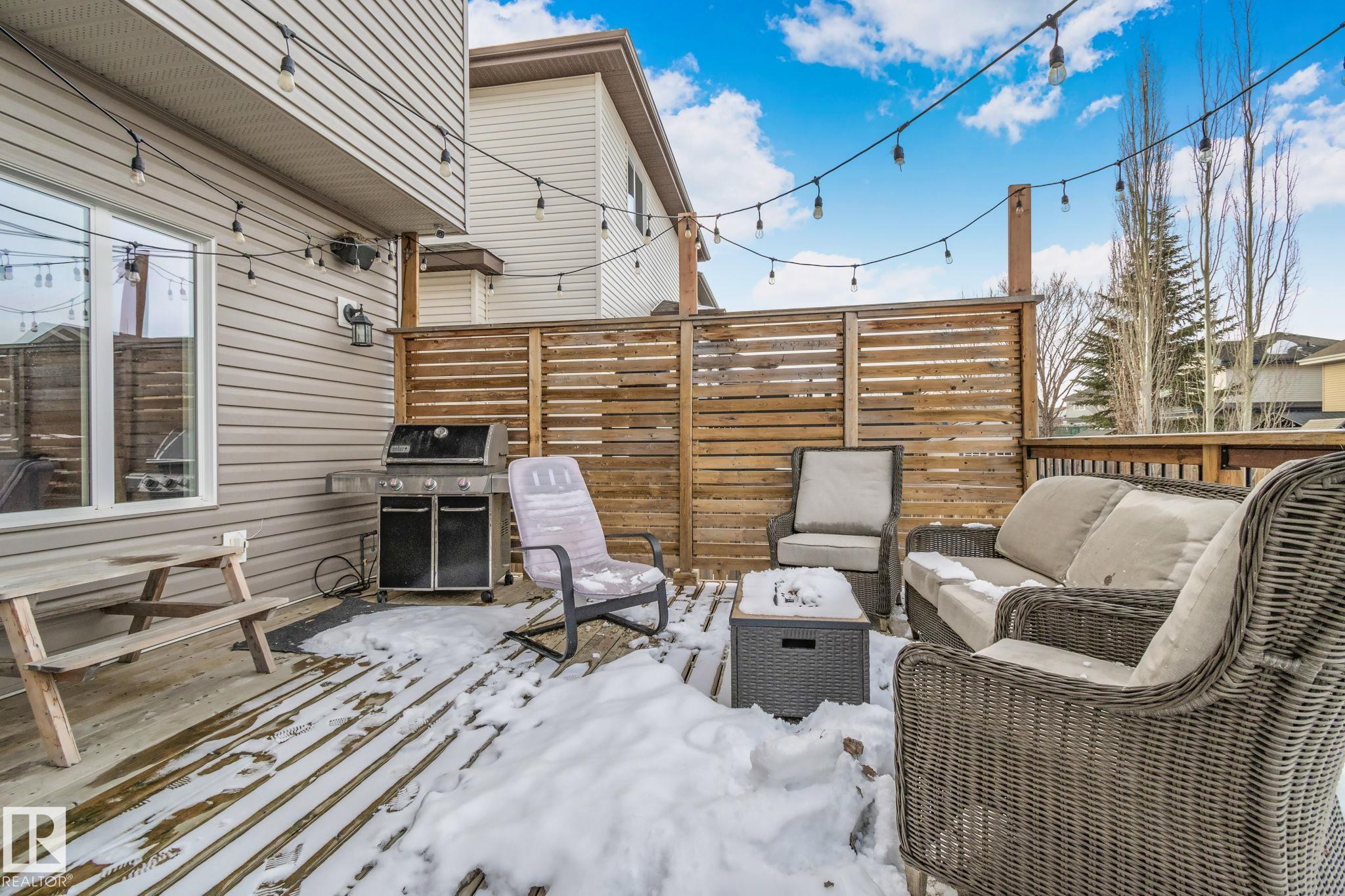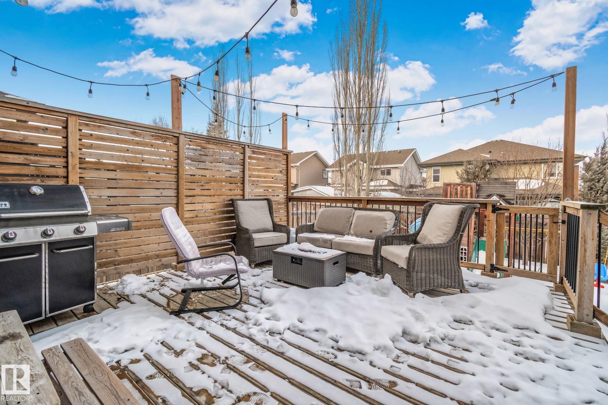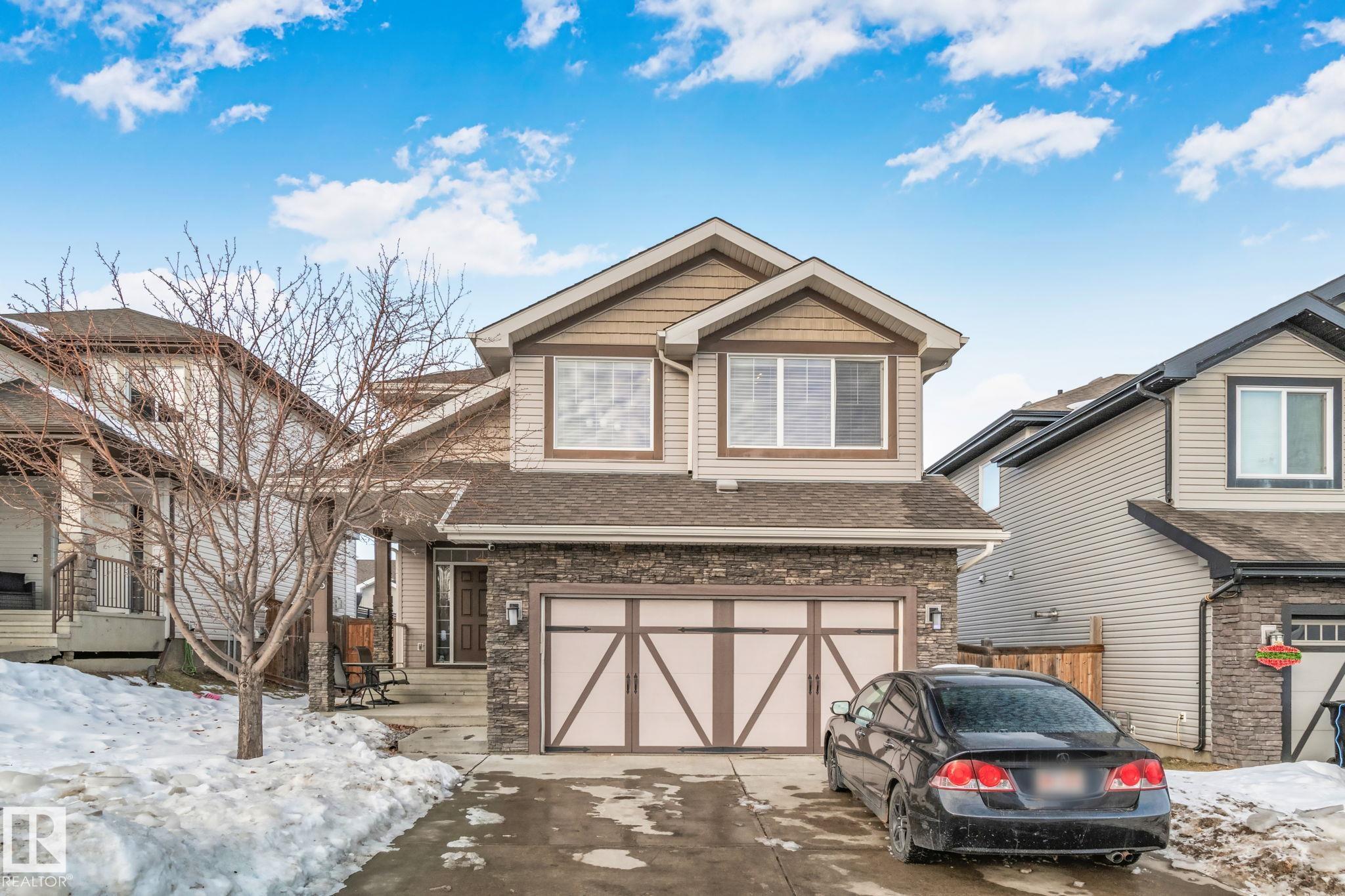 This home is Beautiful. Curb Appeal 10/10 - Giant Covered front entrance, dark rundle stone...and the Backyard is great with mature trees, play structure, beautiful deck with privacy screen, gas BBQ connection! It's perfect! Inside, over 2000 sq ft 2 storey with a very OPEN and unique layout. MASSIVE Light filled bonus room with TALL vaulted ceilings and beautiful architectural cuts. True laundry room just off the bonus room. 3 beds up, 2 bathrooms, great Primary room with a soaker tub and shower ensuite. A/C!! Main Floor is wide open - LARGE front entrance, open view of the living room and that custom fireplace built in. Newer vinyl plank on main and bonus room, Granite countertops, BEAUTIFUL kitchen has Maple Cabinets, Large Island, Corner Pantry. Take 3 Steps down into your 1/2 Bath, Bench for storage and Double Garage entrance. Basement has been fully FRAMED for bedroom, bathroom, storage and living area. WALK to JUBILEE PARK, Schools, Restaurants, Quick Edmonton Access!! 10/10!!
