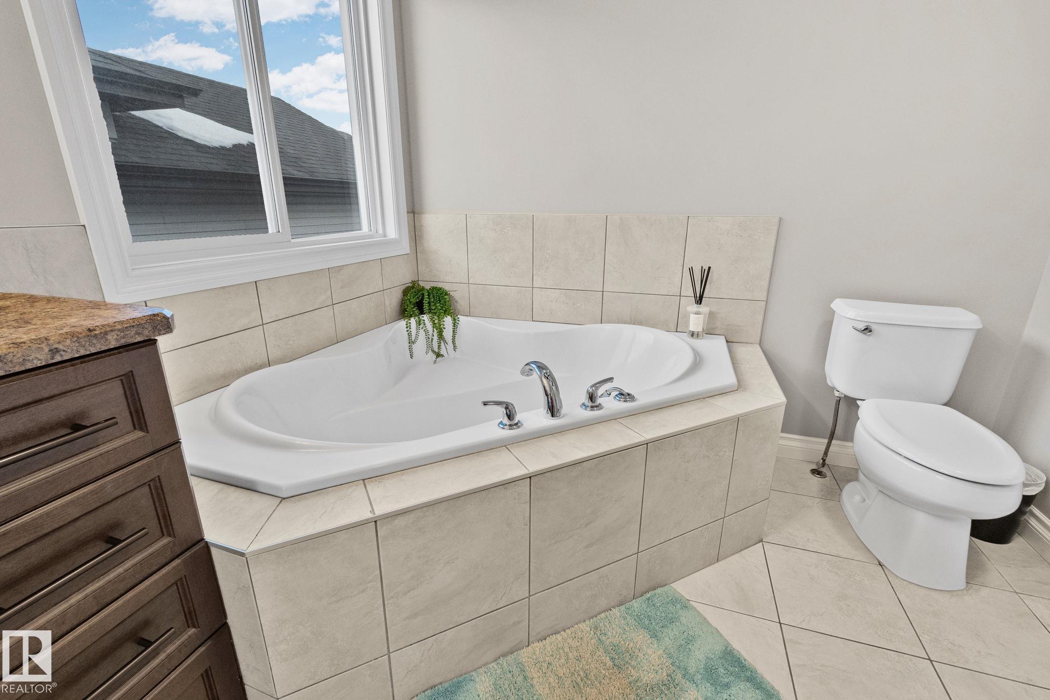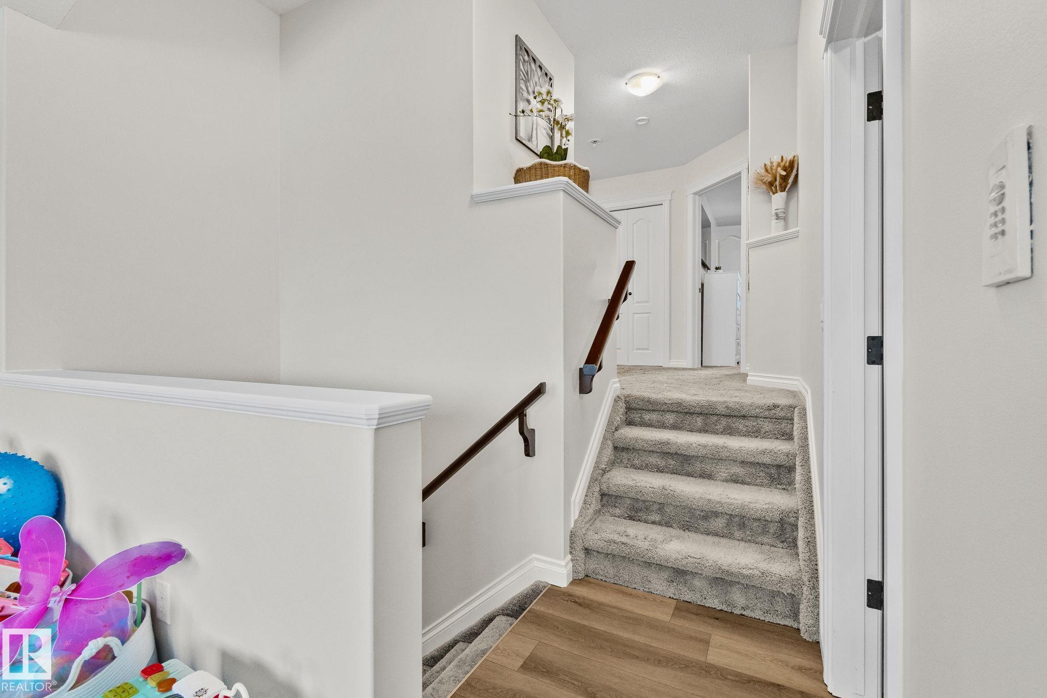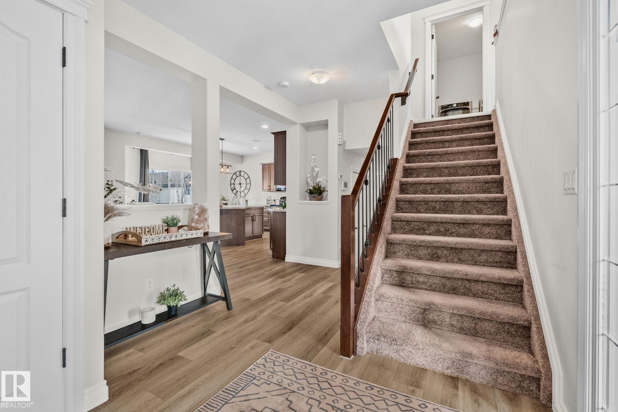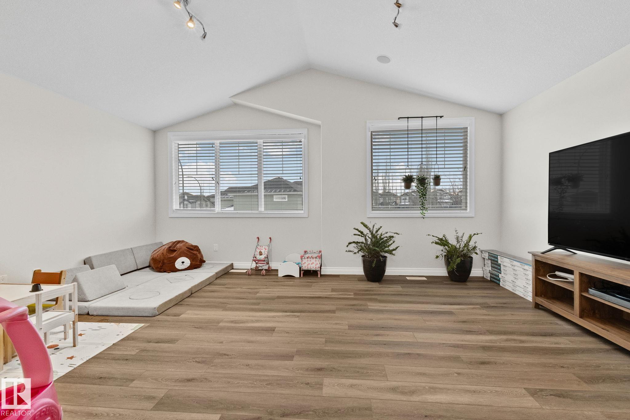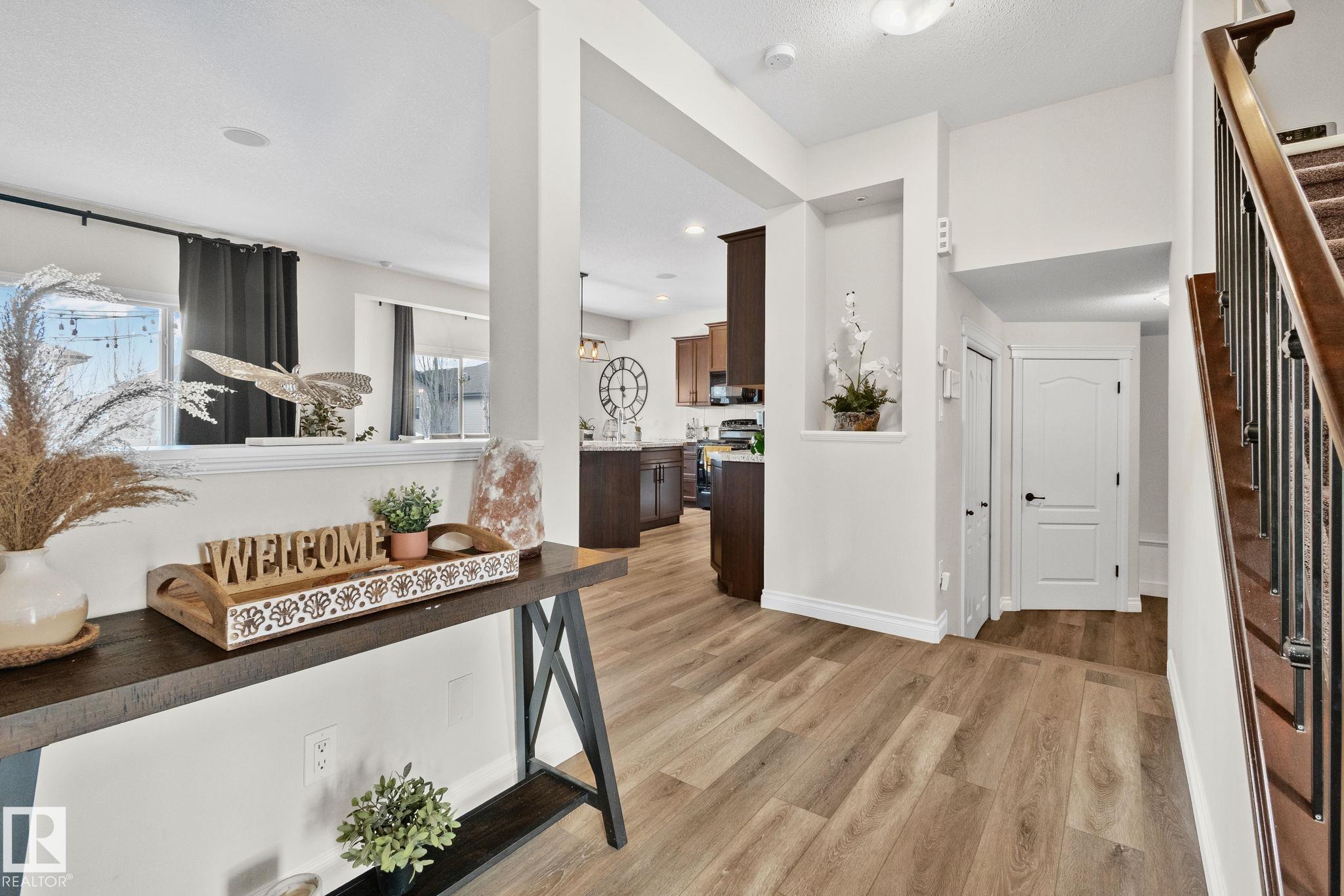 This home is Beautiful. Curb Appeal 10/10 - Giant Covered front entrance, dark rundle stone...and the Backyard is great with mature trees, play structure, beautiful deck with privacy screen, gas BBQ connection! It's perfect! Inside, over 2000 sq ft 2 storey with a very OPEN and unique layout. MASSIVE Light filled bonus room with TALL vaulted ceilings and beautiful architectural cuts. True laundry room just off the bonus room. 3 beds up, 2 bathrooms, great Primary room with a soaker tub and shower ensuite. A/C!! Main Floor is wide open - LARGE front entrance, open view of the living room and that custom fireplace built in. Newer vinyl plank on main and bonus room, Granite countertops, BEAUTIFUL kitchen has Maple Cabinets, Large Island, Corner Pantry. Take 3 Steps down into your 1/2 Bath, Bench for storage and Double Garage entrance. Basement has been fully FRAMED for bedroom, bathroom, storage and living area. WALK to JUBILEE PARK, Schools, Restaurants, Quick Edmonton Access!! 10/10!!