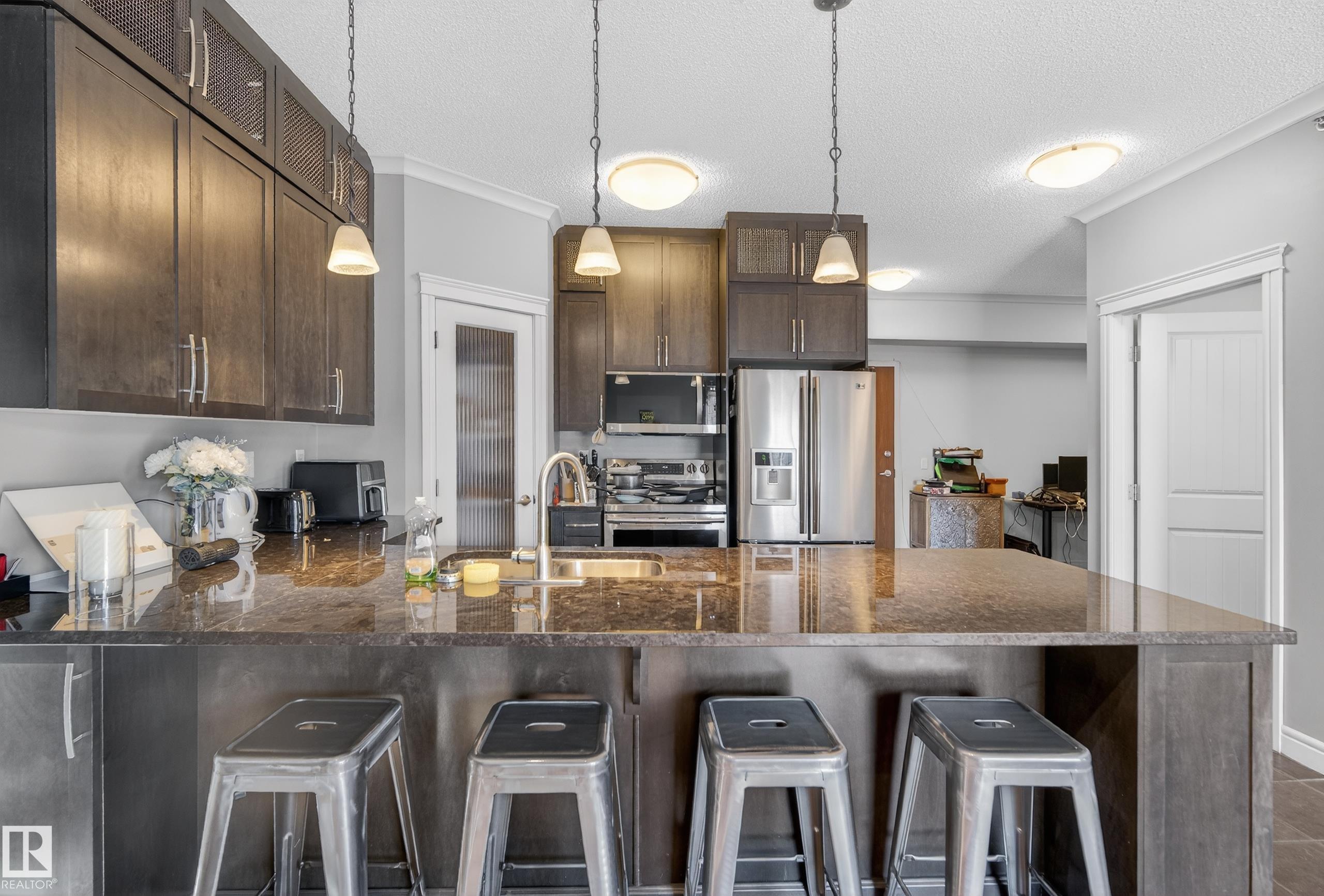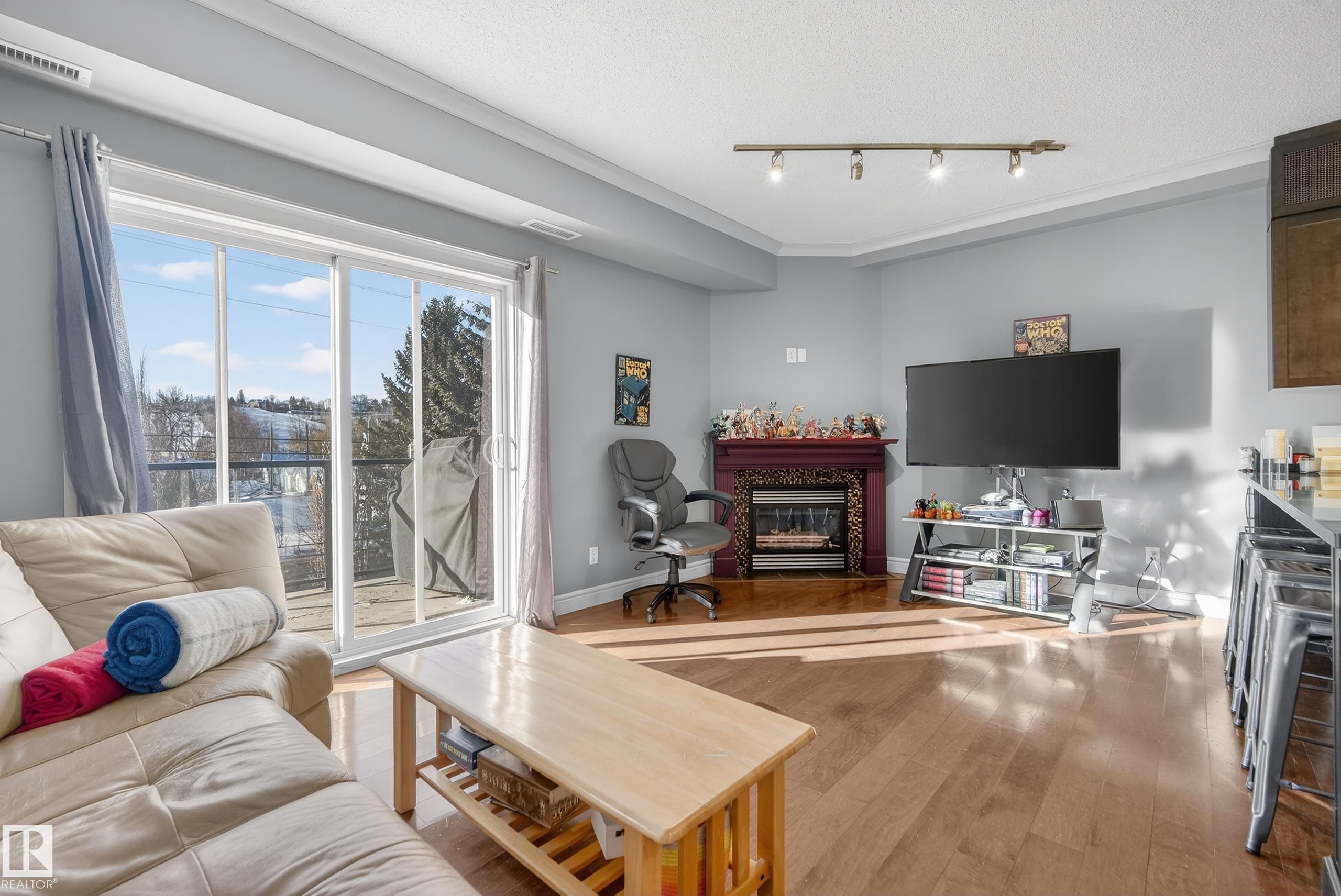 Welcome to The Soho in Cloverdale, where urban convenience meets river valley living. This beautifully appointed 3rd-floor 1 bed + den condo offers the perfect blend of comfort, style & location. Featuring 9 ft ceilings and rich hardwood floors, the open-concept great room is anchored by a cozy corner gas fireplace and filled with natural light from your south-facing balcony?perfect for relaxing or entertaining. The kitchen showcases granite countertops, ample cabinetry & a functional layout ideal for everyday living. Enjoy year-round comfort with central A/C, plus the convenience of an underground titled parking stall. The versatile den is perfect for a home office or guest space. Ideally located just minutes to Downtown & the U of A, with scenic walking trails along the Saskatchewan River right at your doorstep. With approx. 741 sq ft, it's a fantastic opportunity for professionals, students or investors alike.
