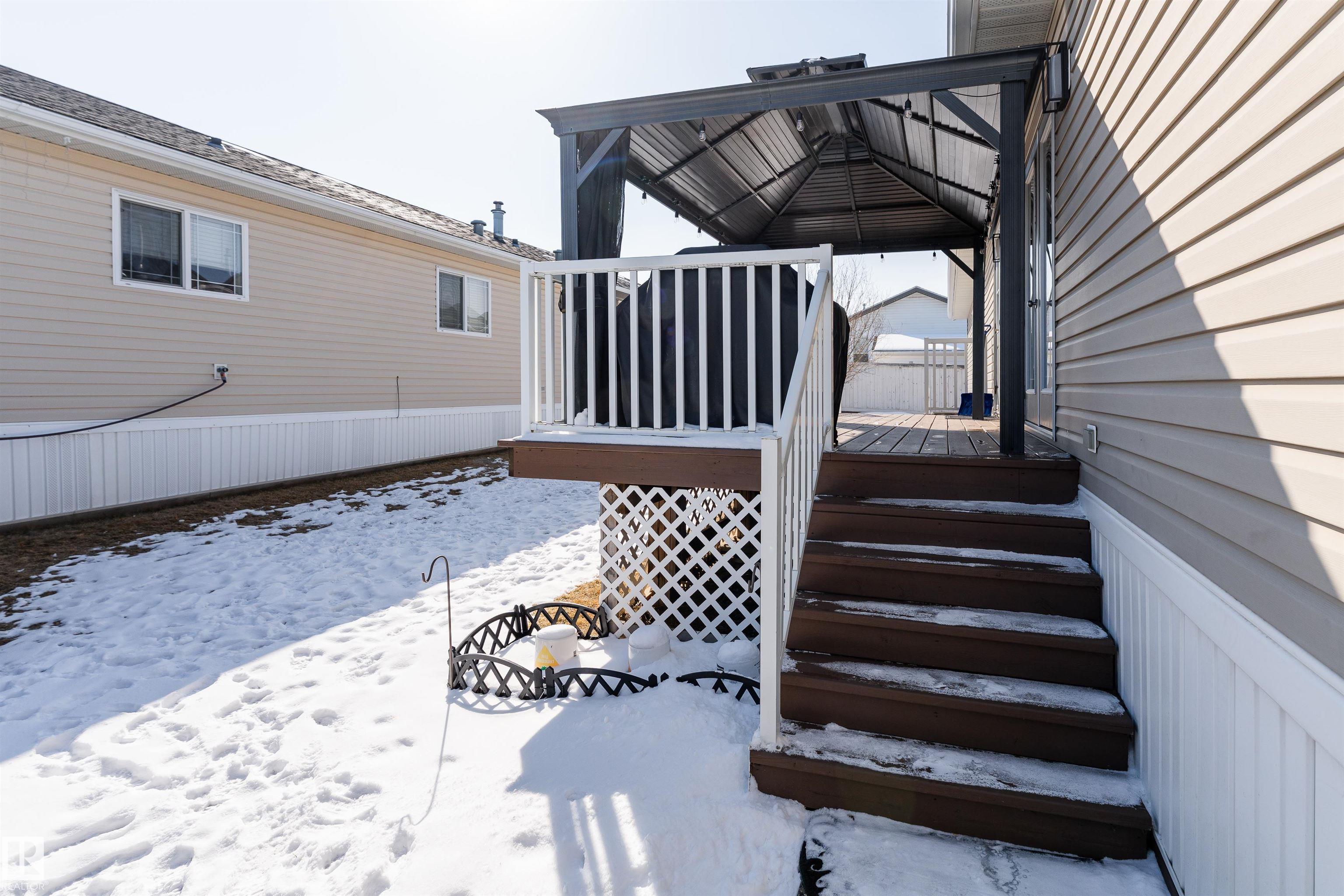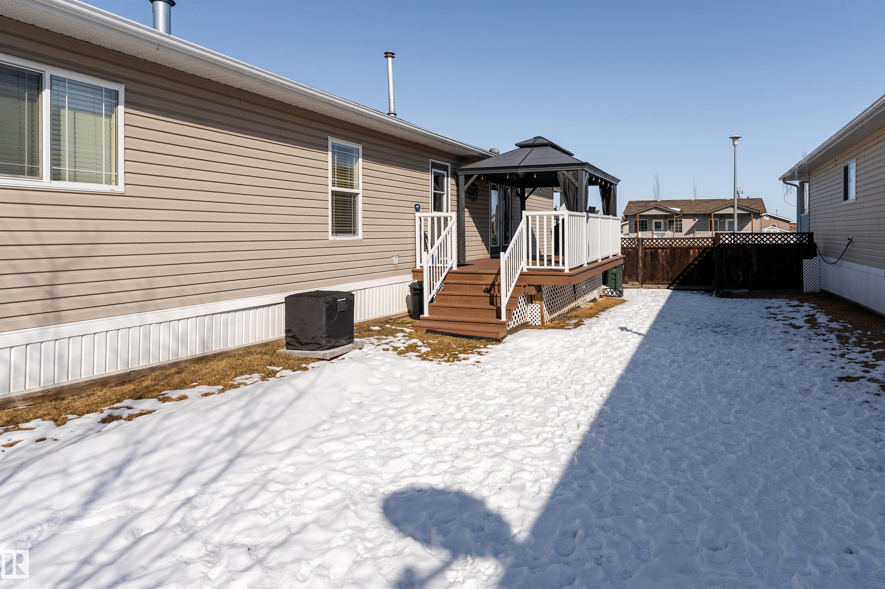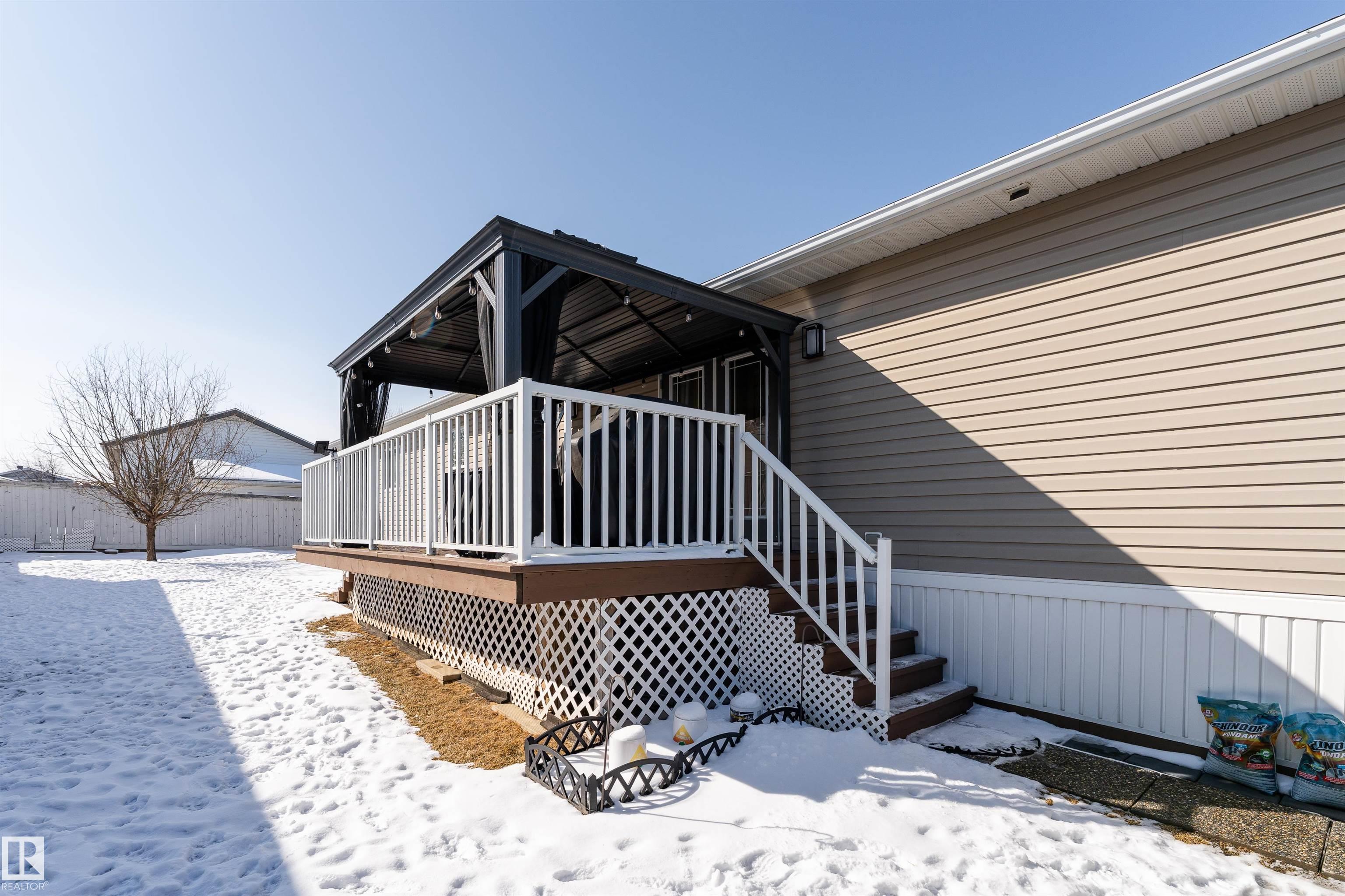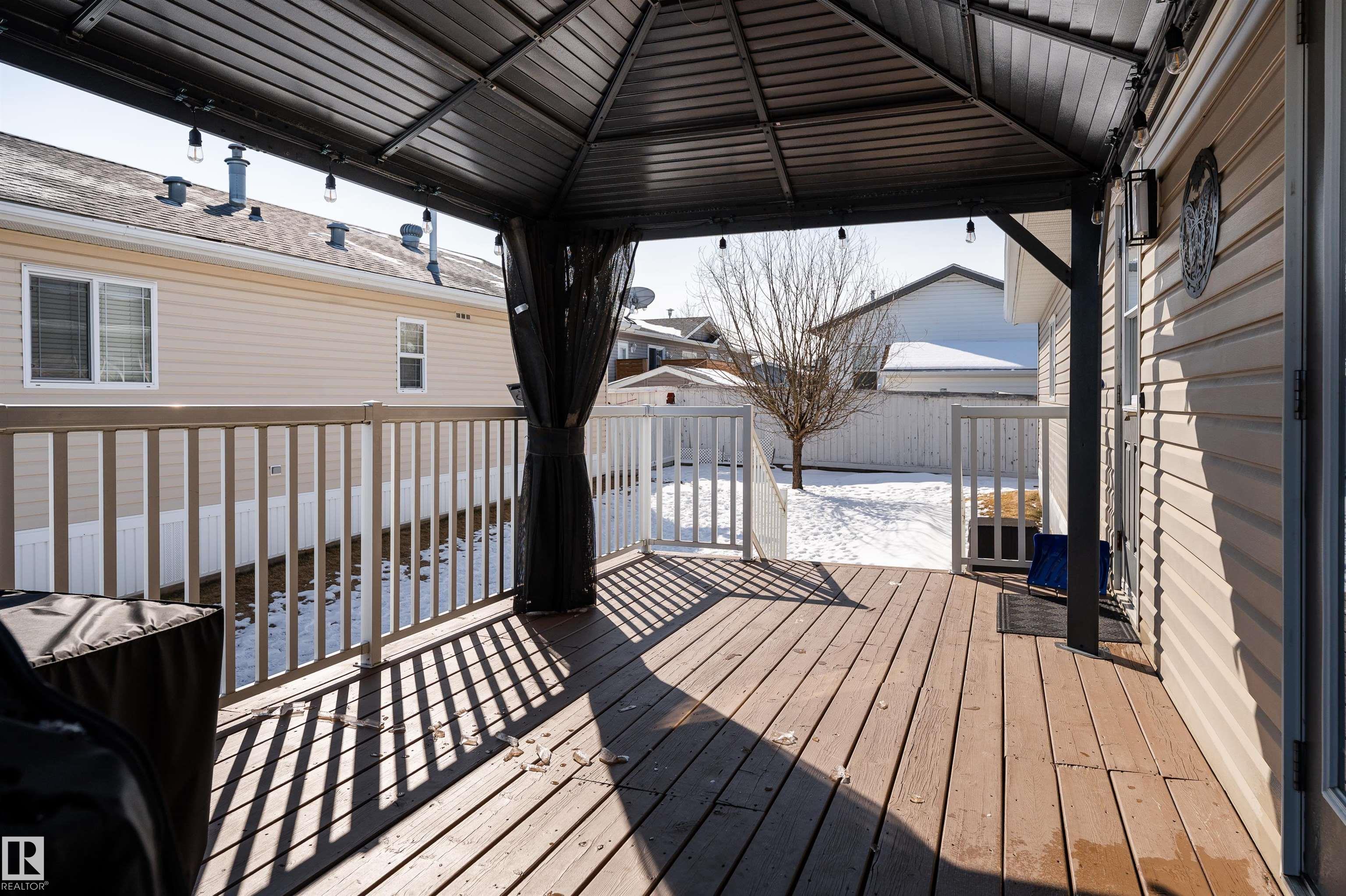 Impressive home featuring central A/C and an inviting covered front entry. Step inside to a bright, freshly painted interior with soaring ceilings and a spacious open-concept layout. The living room is warm and welcoming, highlighted by a bay window, ceiling fan, and cozy electric fireplace. The kitchen is both stylish and functional, offering dark cabinetry, a peninsula island, corner pantry, and matching stainless steel appliances. Garden doors lead to a large deck with attractive railing, complete with a hardtop gazebo?perfect for outdoor entertaining and relaxing. The primary bedroom includes a ceiling fan, walk-in closet, and a private ensuite featuring a corner jetted tub and separate stand-up shower. The oversized laundry room offers excellent versatility and could easily double as a small office with additional laundry hookups conveniently located in the back porch. The property also offers additional overflow parking just across the street.