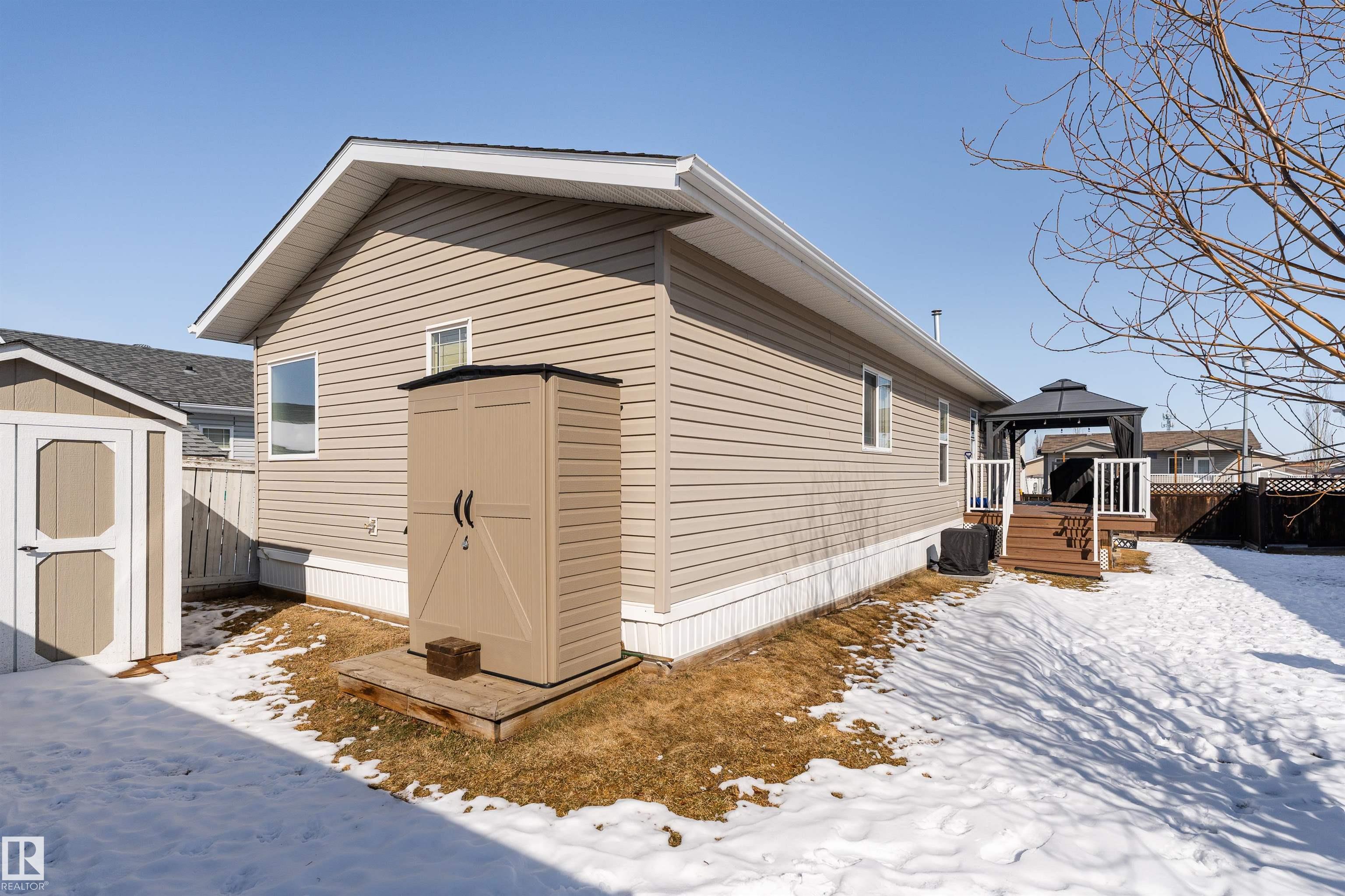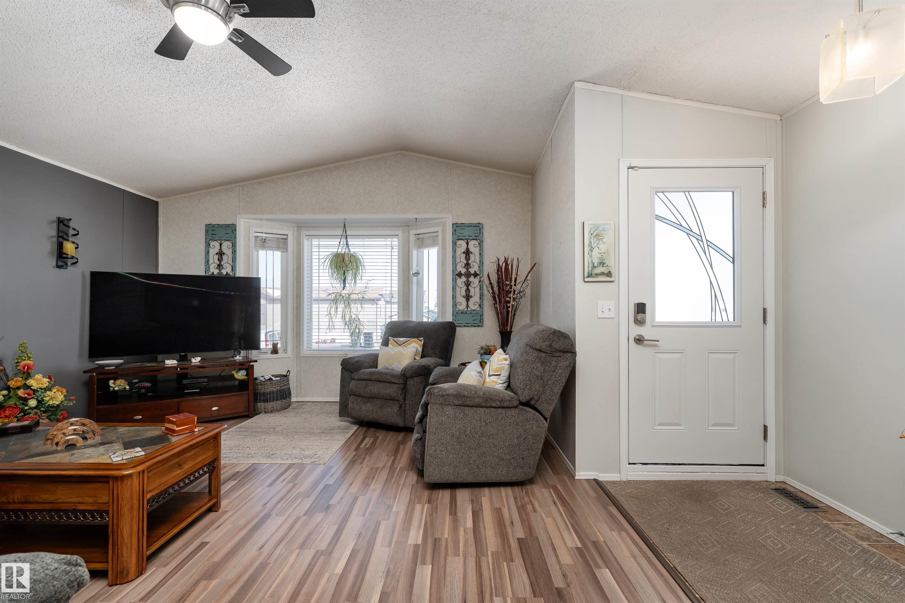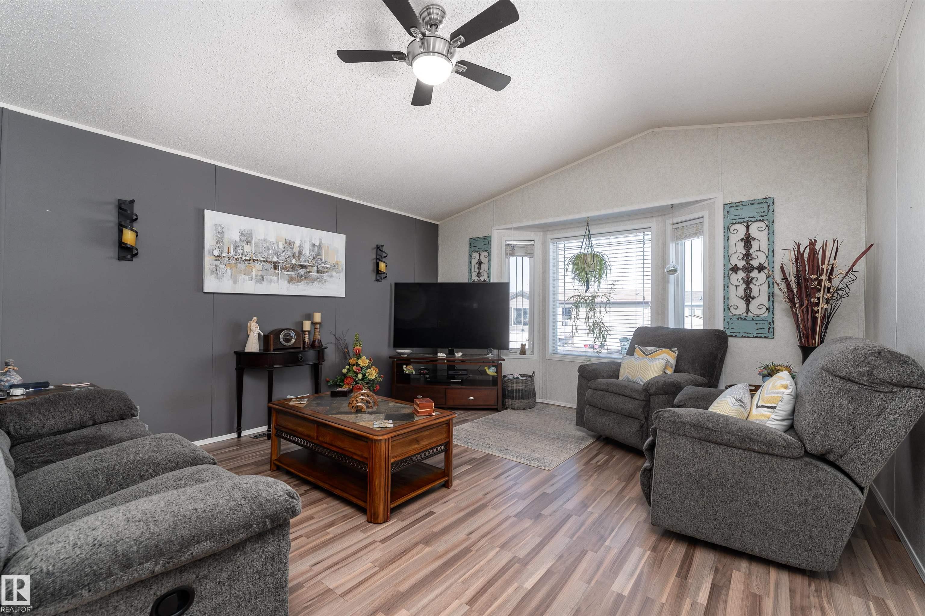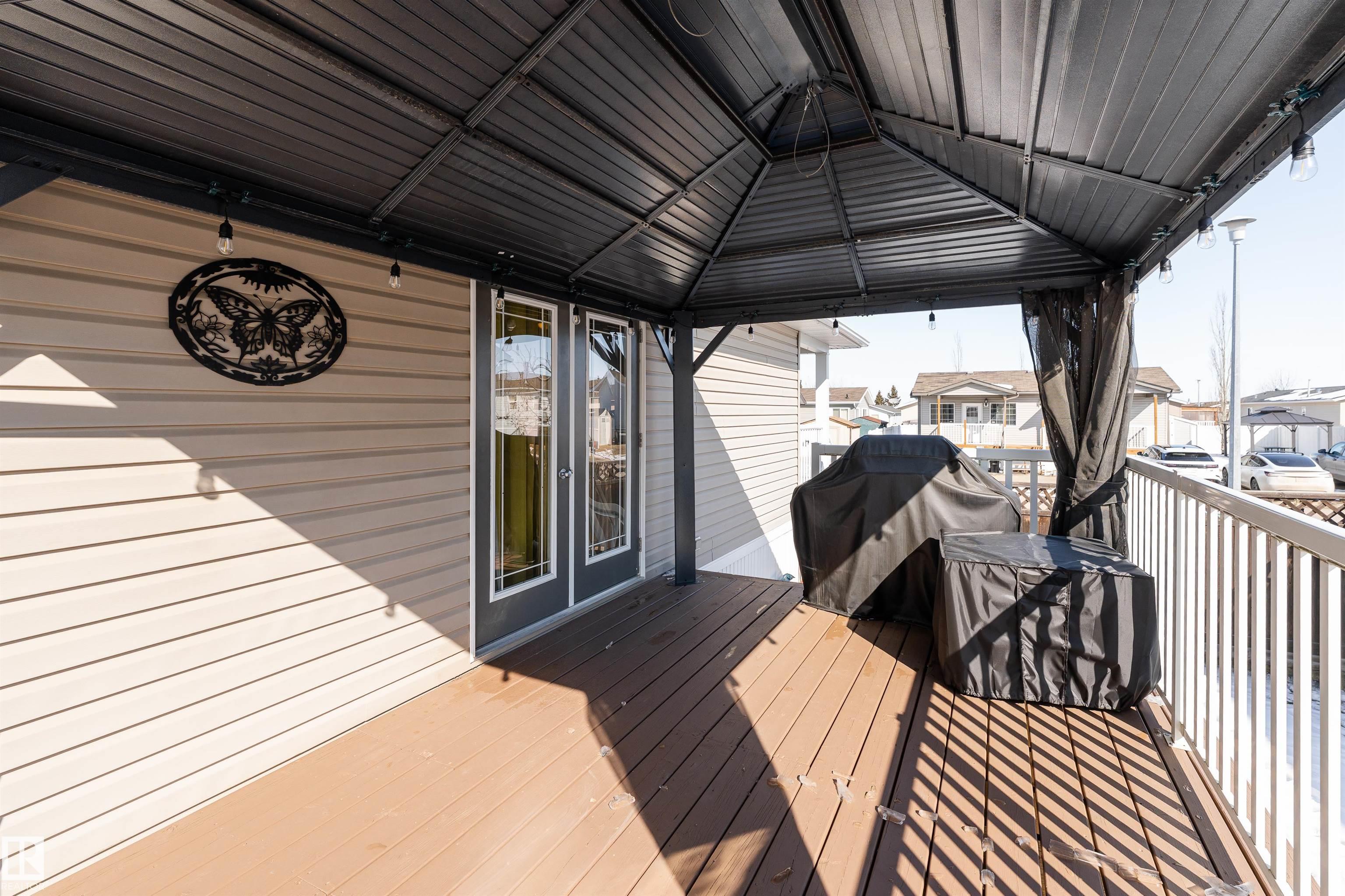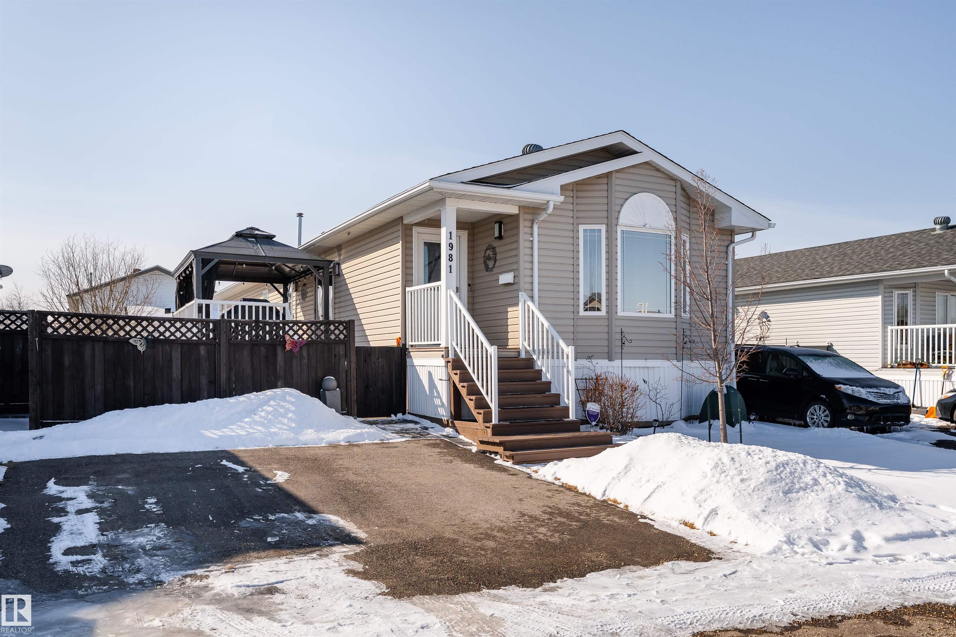 Impressive home featuring central A/C and an inviting covered front entry. Step inside to a bright, freshly painted interior with soaring ceilings and a spacious open-concept layout. The living room is warm and welcoming, highlighted by a bay window, ceiling fan, and cozy electric fireplace. The kitchen is both stylish and functional, offering dark cabinetry, a peninsula island, corner pantry, and matching stainless steel appliances. Garden doors lead to a large deck with attractive railing, complete with a hardtop gazebo?perfect for outdoor entertaining and relaxing. The primary bedroom includes a ceiling fan, walk-in closet, and a private ensuite featuring a corner jetted tub and separate stand-up shower. The oversized laundry room offers excellent versatility and could easily double as a small office with additional laundry hookups conveniently located in the back porch. The property also offers additional overflow parking just across the street.